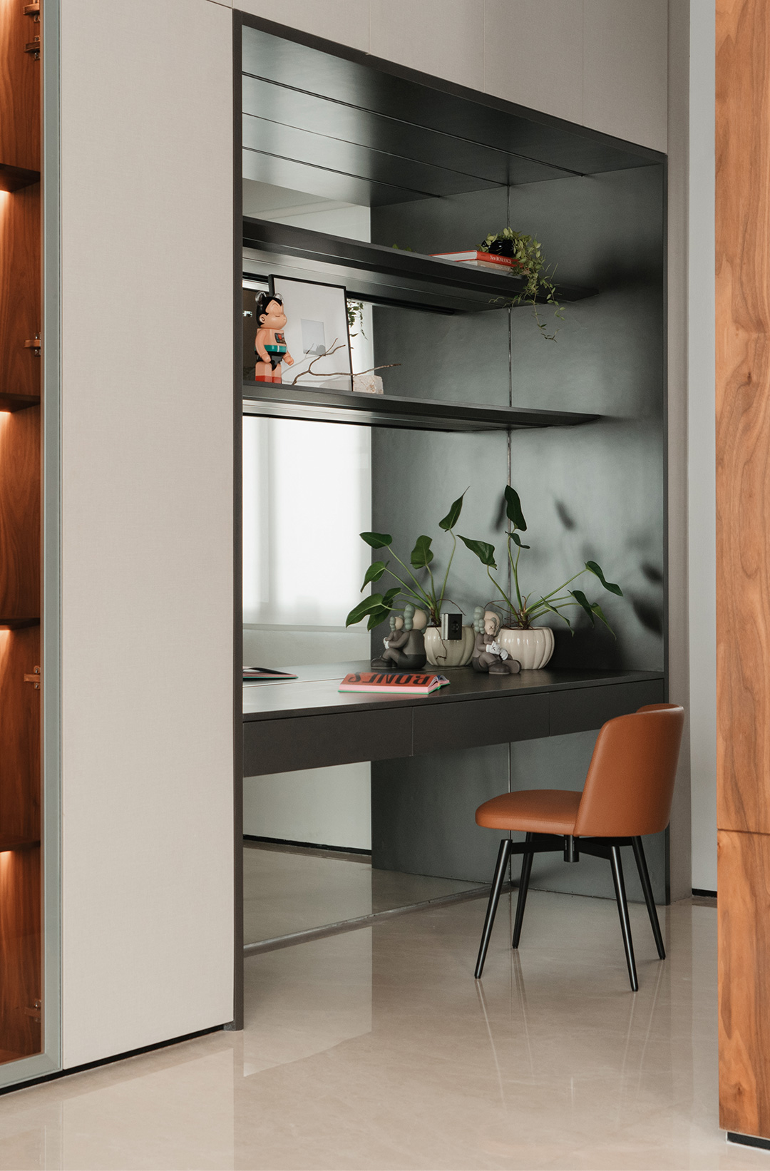 With such imaginative design, mild and moderate furniture is needed for balance. CAMERICH furniture is elegantly arranged throughout the space: the soft EASYTIME sofa, the gentle VAST chair, the clean-lined MATRIX cabinet, the comfortable MELODY bed, and the streamlined ECHO chair... Their quiet inclusiveness harmoniously coexists with the traditional South Asian wood elements, trendy dolls, and paintings of varied styles, forming a magical yet stable fusion.