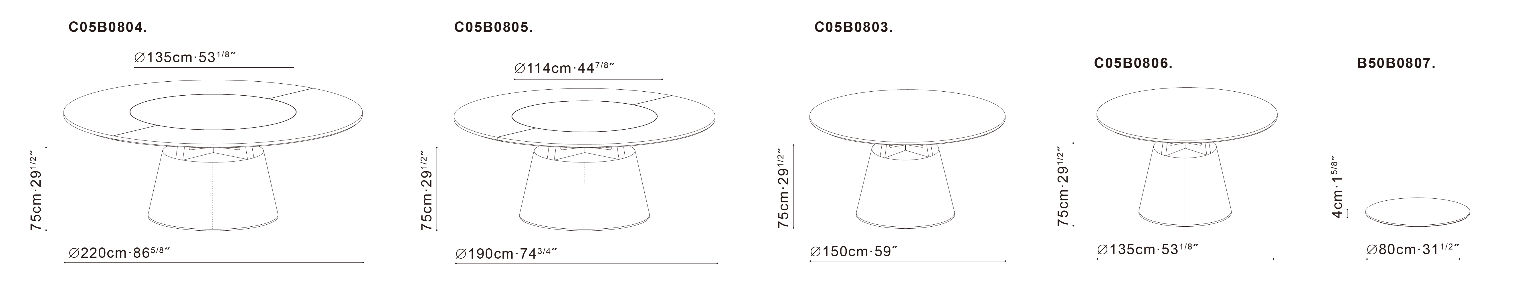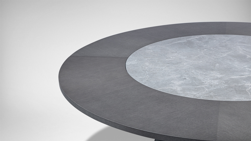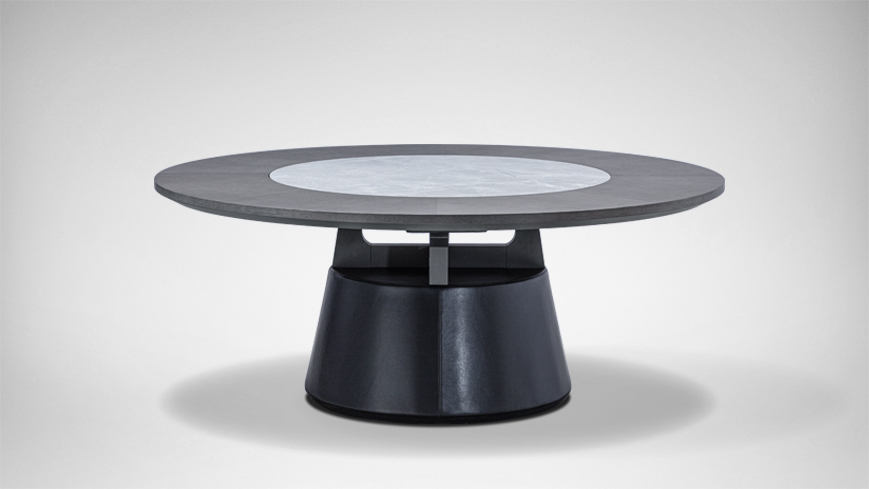 圆形的桌面,圆锥体的桌腿,简约现代。中间的小圆形桌面可自由转动,满足众人就餐的需要。
