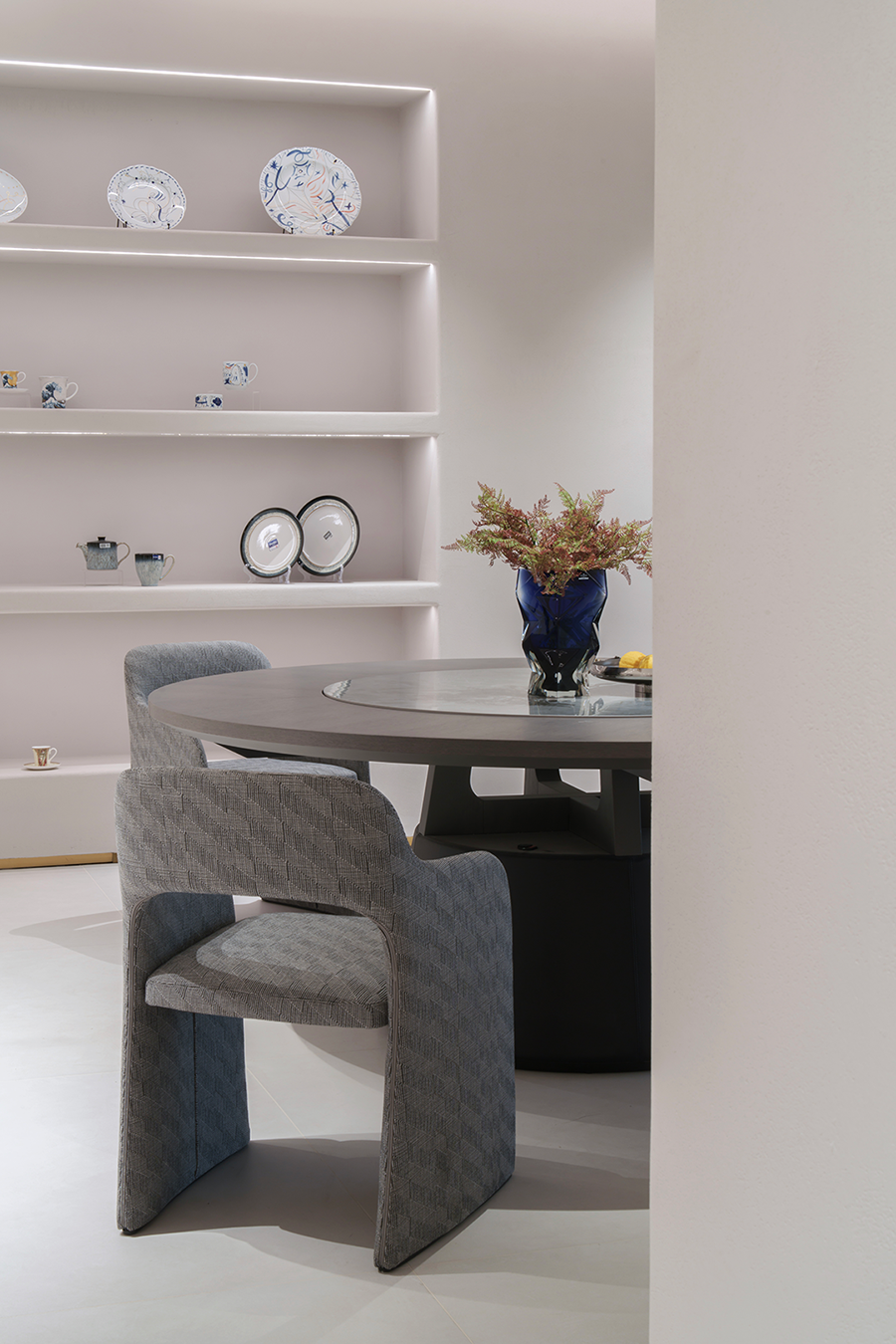 锐驰在生活美学空间的陈列设计中,采用了极简风,化繁为简恰如大音希声。同时青花瓷盘、玻璃装饰与圆形餐桌等元素的协调搭配,又为整体设计增添了生活的温度。
